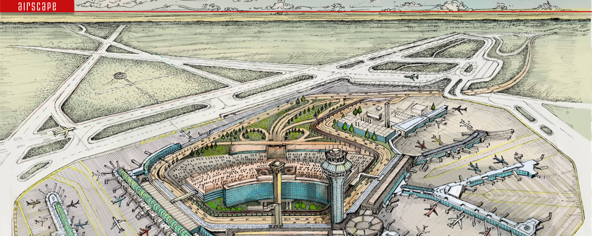 For all that, Phil Thompson has managed to bring the airport back to earth, as it were. He has illustrated it from an oblique bird’s eye view, using his favoured pen and ink. It’s a style that brings to mind those amazing elevated city views from pre-aviation history (feats of artistic imagination that have always amazed me).