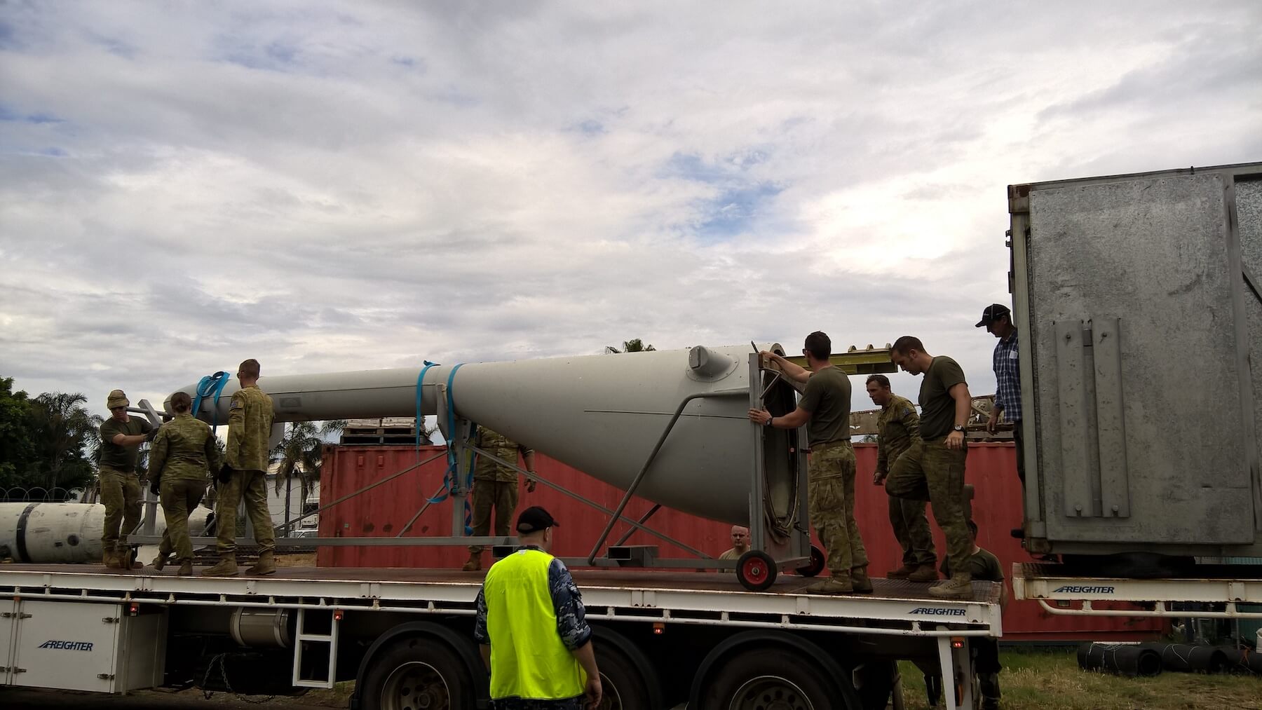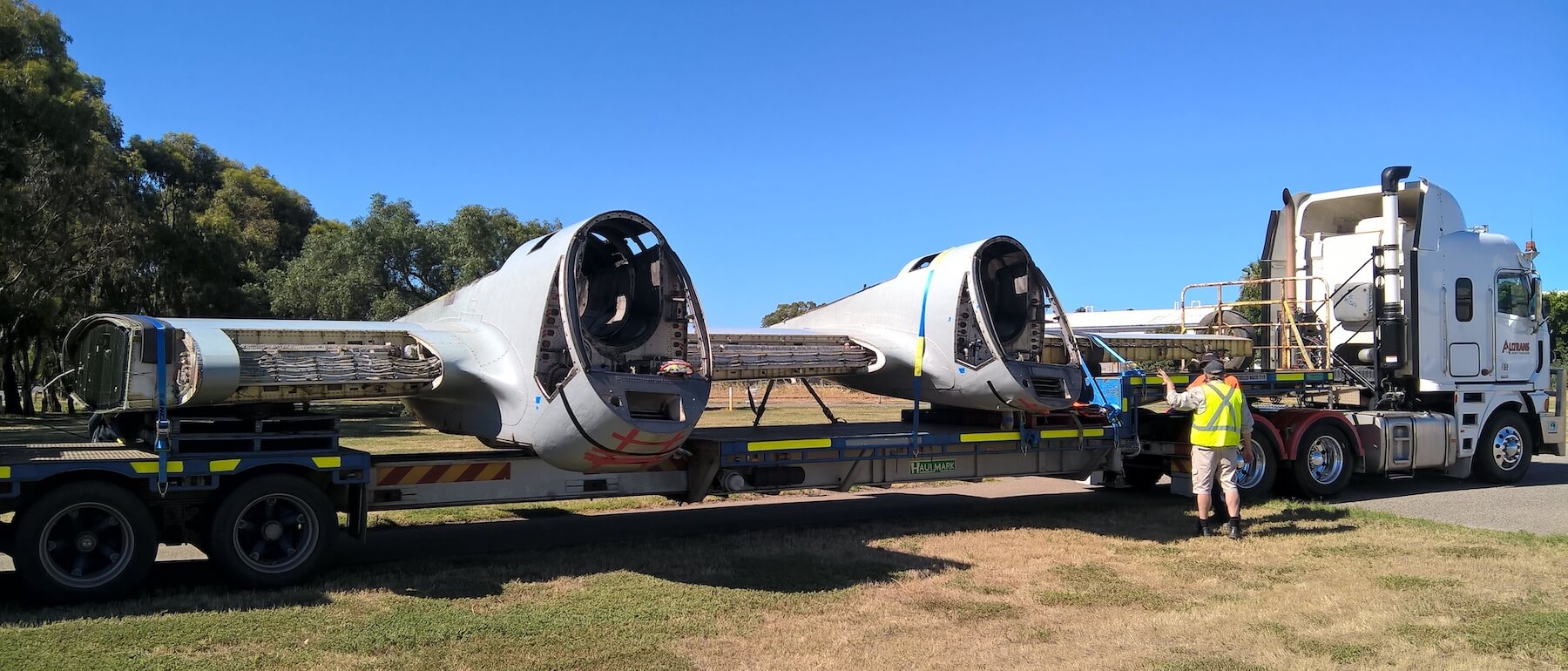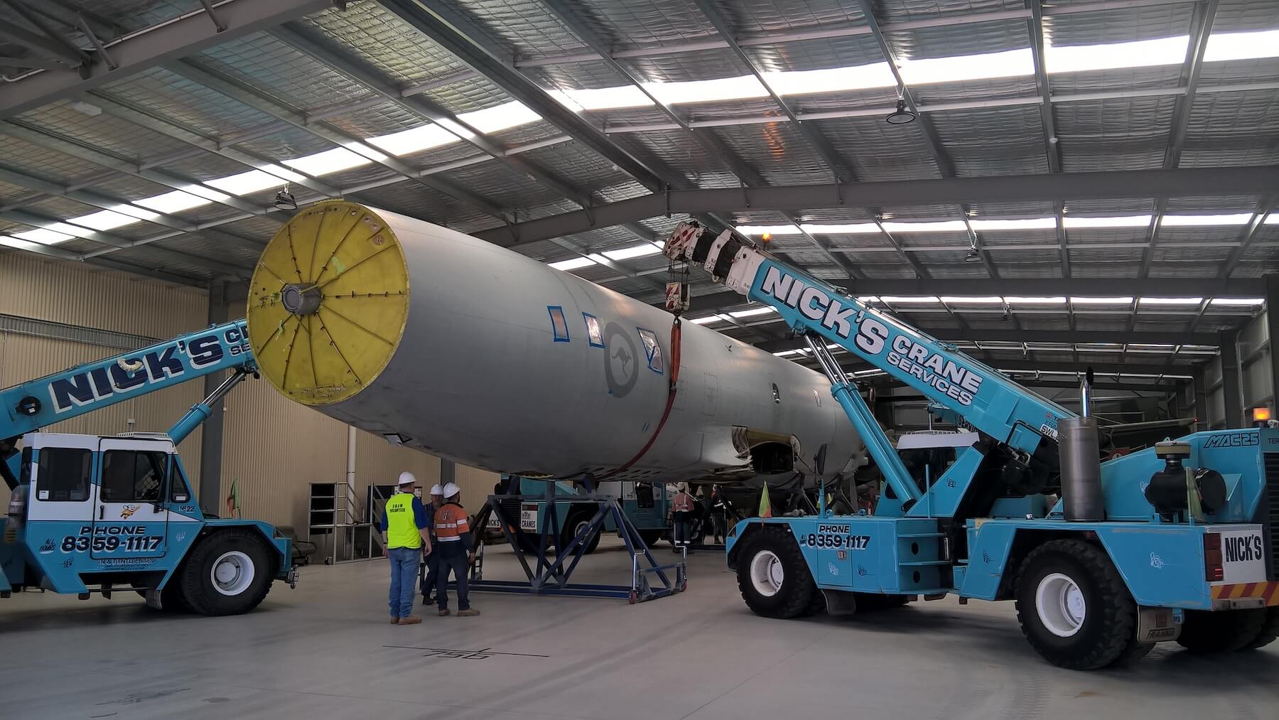 That delivery had been preceded several weeks earlier by the arrival of six semi trailers carrying engines, propellers, nose and aft radomes, rudder, elevators, ailerons and flaps, which were tucked away in various storage locations and shipping containers by museum staff and personnel from 1 Combat Service Support Battalion, ADF.