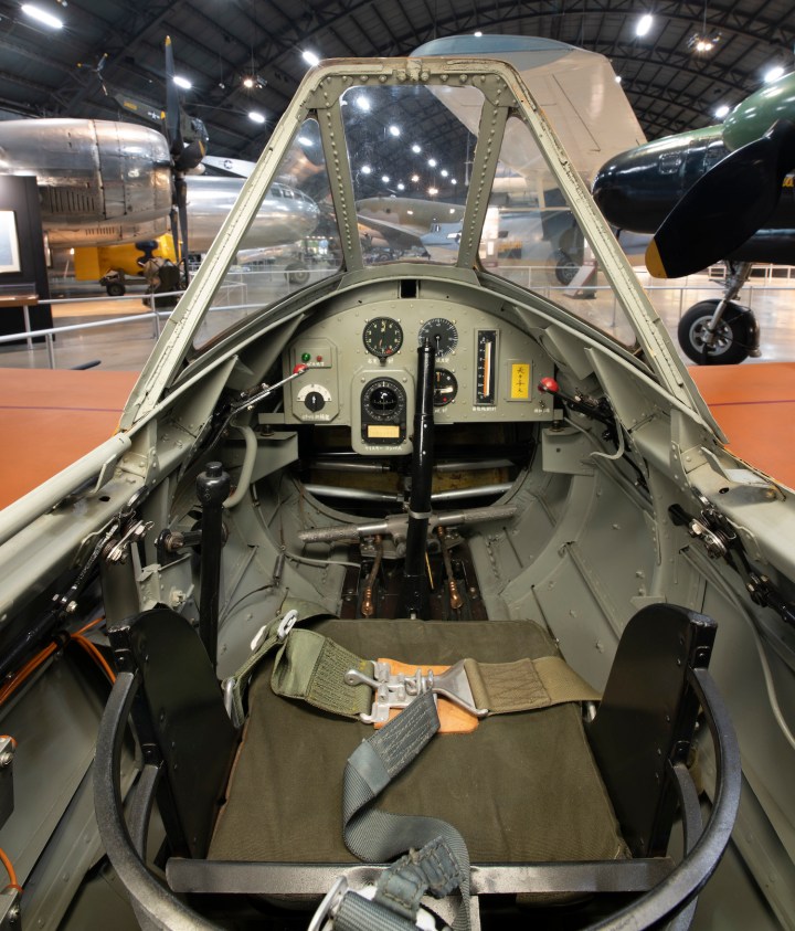 When gliding down in the Zeros it was easy to see the ground. The visibility was superb and I could instantly orient myself. But now, squeezed into this tiny box, I couldn’t bank and look down.