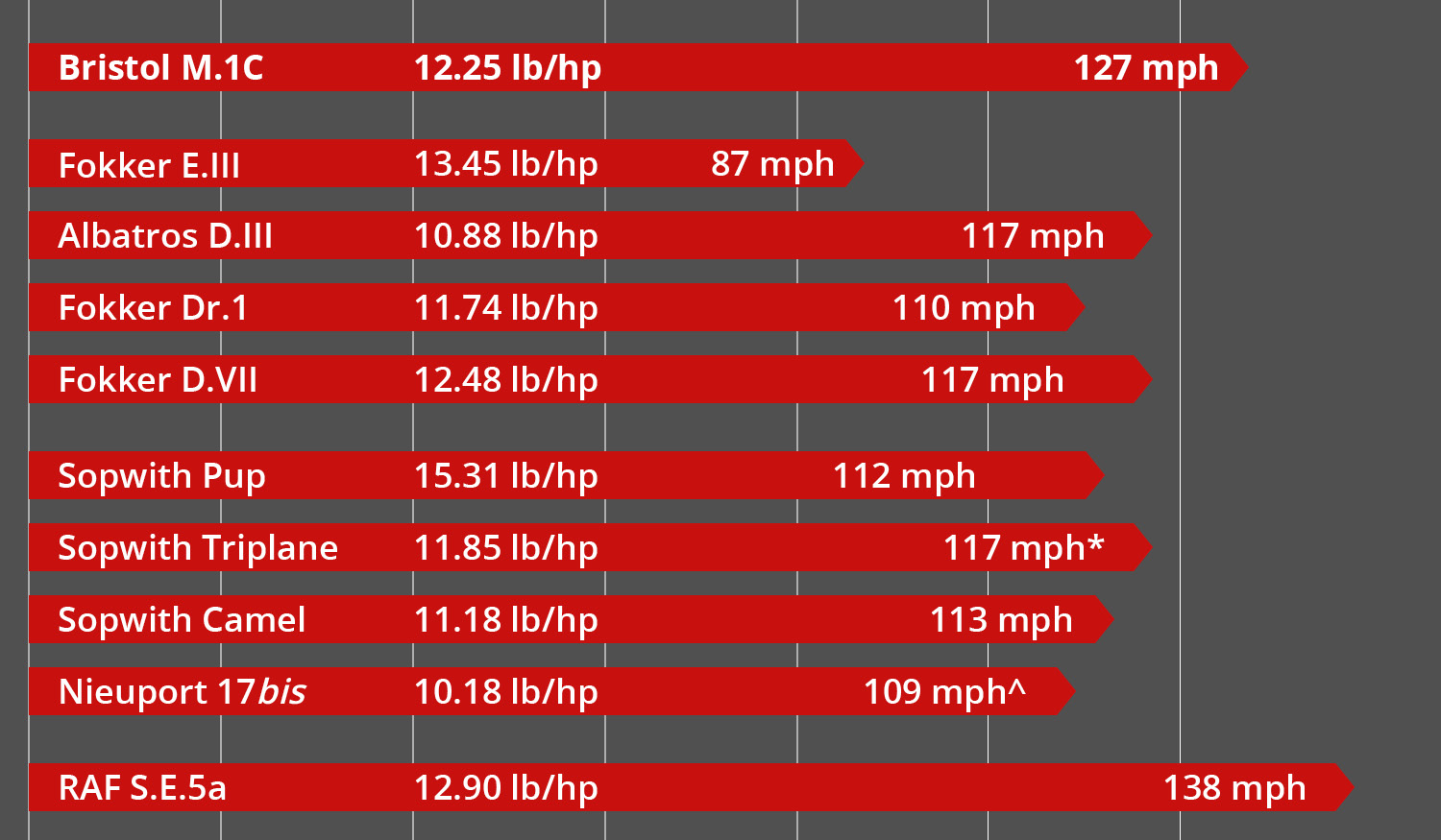 It worked. In tests at the RFC Central Flying School, the M.1A booked a top speed of 127 mph* (204 km/h, 110 knots) – 40 mph or nearly 150% faster than the Fokker E.III Eindecker it had been designed to tame. In the same tests, the aircraft climbed to 10,000 feet in an astonishing 8.5 minutes. (In 1918, British ace James McCudden VC climbed a production M.1C to the same altitude in only 7 minutes!)