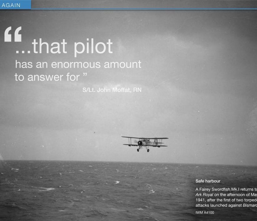 John Moffat You may not have heard of John (‘Jock’) William Charlton Moffat. Not enough people have. On May 26th, 1941, Moffat and his crew of Fairey Swordfish 5C, L9726, flying off HMS Ark Royal in appalling weather, launched the torpedo that crippled the mighty Nazi battleship Bismarck. It was already Britain’s last roll of the dice against Bismarck, and arguably the most pivotal single act … Continue reading That pilot
